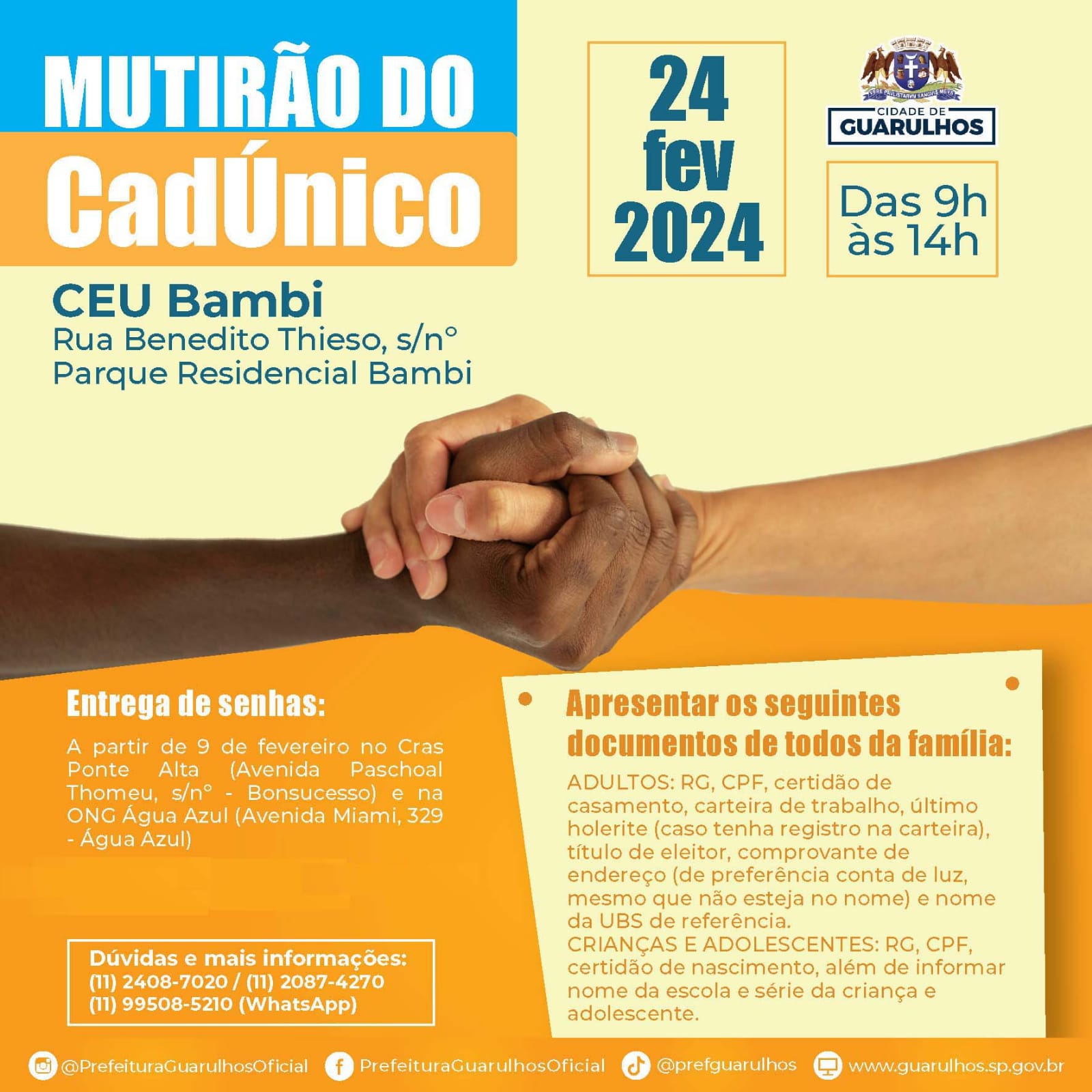 O evento é promovido pela Prefeitura de Guarulhos e receberá a população das 9h às 14h para ofertar a realização de inscrições no Cadastro Único para Programas Sociais (CadÚnico), atualização de dados, solicitação de benefícios e orientações diversas.